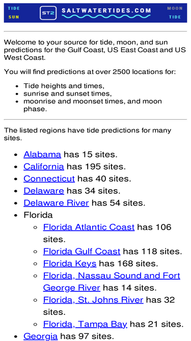 86%low and high tide predictions for the gulf coast, florida keys, us east coast, and us west coast with sunrise, sunset, moonrise, moonset, and moon phase.