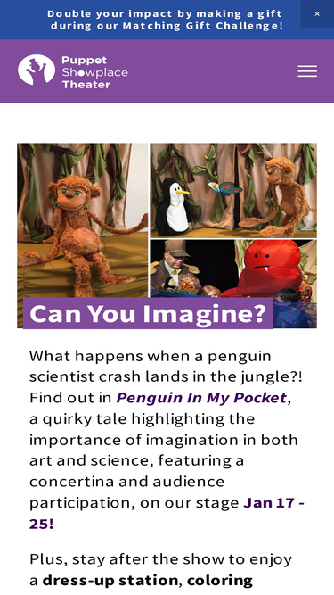 100%Puppet Showplace Theater is Boston’s favorite puppet theater. Enjoy children’s puppet theater and amazing puppetry for adults in Brookline, MA.