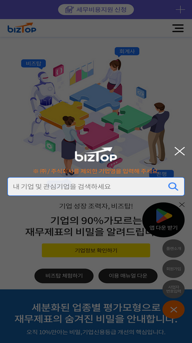 87%비즈탑은 업종별 평가모형을 통해 기업유형, 미래가치, 경영목표치, 자금수급가능성분석 등의 재무제표 관리업무를 1/5로 줄여드립니다.