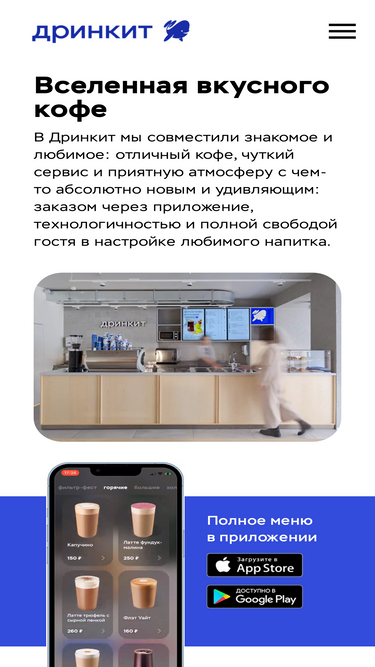 80%Сеть кофеен нового формата в которой можно не только сделать заказ на месте, но и заказать любимый напиток по дороге в кофейню через приложение Дринкит, а уже через несколько минут забрать всё со специальной стойки-выдачи.
