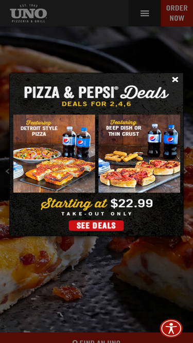 74%Welcome to Uno Pizzeria & Grill. Uno's legendary Chicago Style Deep Dish Pizza is just the beginning! Pizzeria Uno began in 1943 when Ike Sewell invented the Original Chicago Deep Dish Pizza. Today, the menu has evolved to offer a variety of high quality grill items in addition to the famous Chicago-style deep dish pizza.
