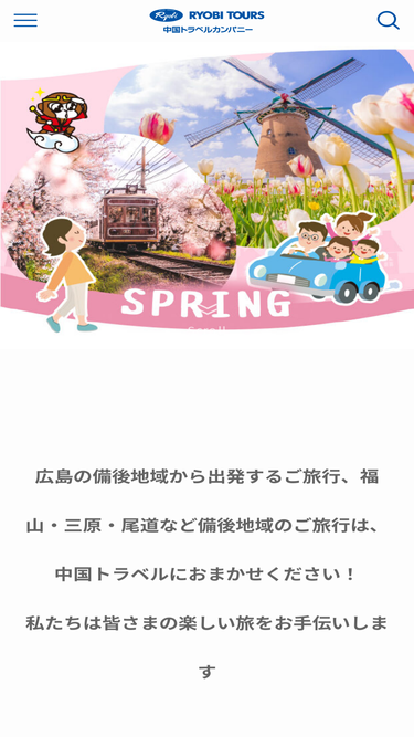100%福山、尾道、三原など備後地域から出発する旅行、また備後、瀬戸内エリアの旅行は地域密着型の旅行代理店「中国トラベルカンパニー」におまかせください!この地域を知り尽くしたスタッフがアットホームな雰囲気でお迎えいたします。中四国や近畿方面へのパックツアーから修学旅行、団体旅行、また近畿日本ツーリストのプランまで幅広くお取り扱いしております。