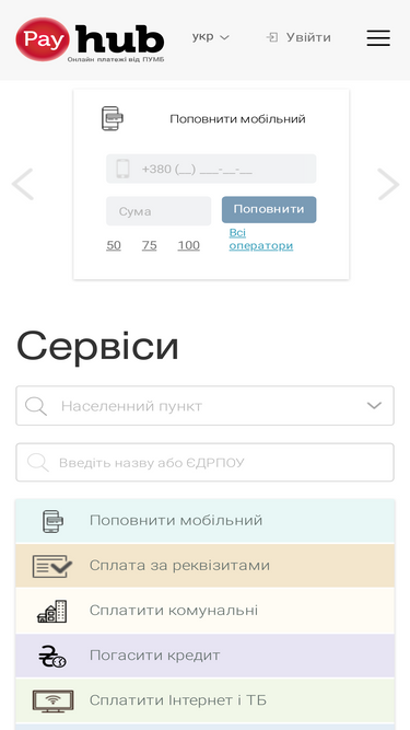 78%PAYHUB – це сервіс онлайн-оплат від банку ПУМБ. Всі звичні платежі, більш ніж 60 000 сервісів, Ви можете здійснювати на PAYHUB, миттєво і не виходячи з дому.