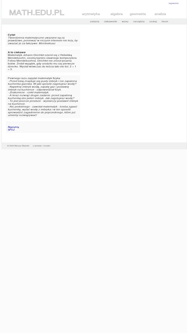 73%serwis poświęcony matematyce. czytelnik znajdzie tu garść informacji z dziedziny geometrii, algebry i arytmetyki, trochę ciekawostek oraz zadań.