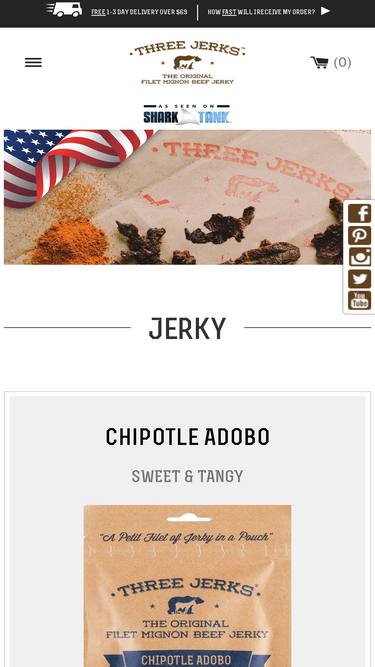 94%Only the finest filet mignon is used when making Three Jerks Jerky. We carefully and lovingly jerkify our fine meats without any preservatives or additives.