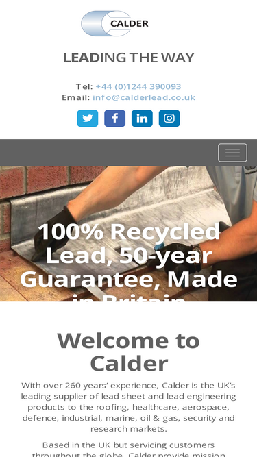 97%with over 260 years’ experience, calder is the uk’s leading supplier of lead sheet and lead engineering products to the roofing, healthcare, aerospace, defence, industrial, marine, oil & gas, security and research markets. based in the uk but servicing customers throughout the globe, calder provide mission critical solutions with a commitment to reliability, quality and service.
