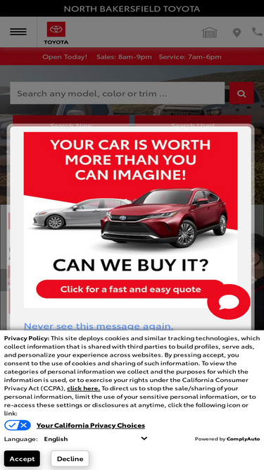 98%north bakersfield toyota carries the newest toyota models and quality used vehicles in our inventory. our service center can assist with auto repairs, maintenance or parts.