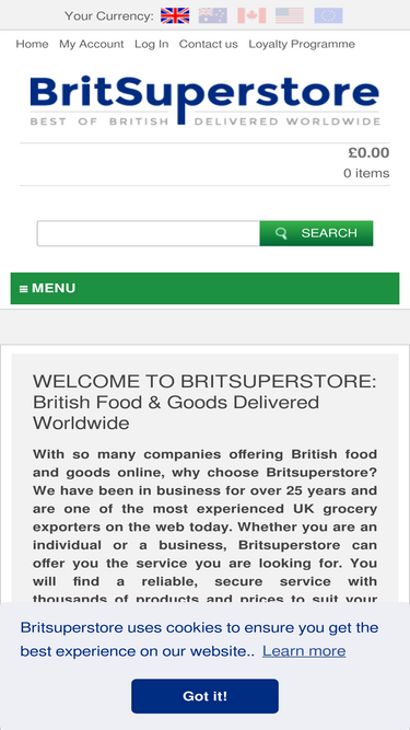 79%welcome to britsuperstore: british food & goods delivered worldwide with so many companies offering british food and goods online, why choose britsuperstore? we have been in business for over 20 years and are one of the most experienced uk grocery exporters on the web today.whether you are an individual or a business, britsuperstore can offer you the service you are looking for. you will find a reliable, secure service with thousands of products and prices to suit your individual needs. we do not hold stock. we are personal shoppers and purchase your goods once you have ordered. our team of dedicated personal shoppers are here to hand pick your goods to ensure the longest possible shelf life and quality. this unique service allows you to browse one site for all your favorite and supermarket brands. all products offered on this website are obtained from the uk market. we only buy goods intended for the uk and labelled appropriately, according to uk regulations.