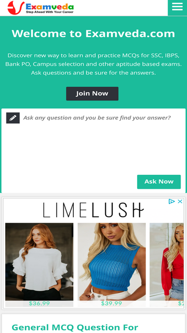 examveda.com is a portal which provide mcq questions for all competitive examination such as gk mcq question, competitive english mcq question, arithmetic aptitude mcq question, data intpretation, c and java programing, reasoning aptitude questions and answers with easy explanations.