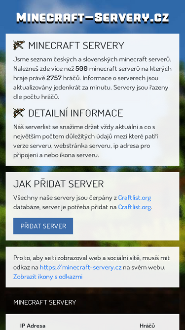 86%Seznam kde nalezneš ty nejhranější CZ/SK minecraft servery. Máme zde Skyblock servery, Minigame servery, PvP servery a další.