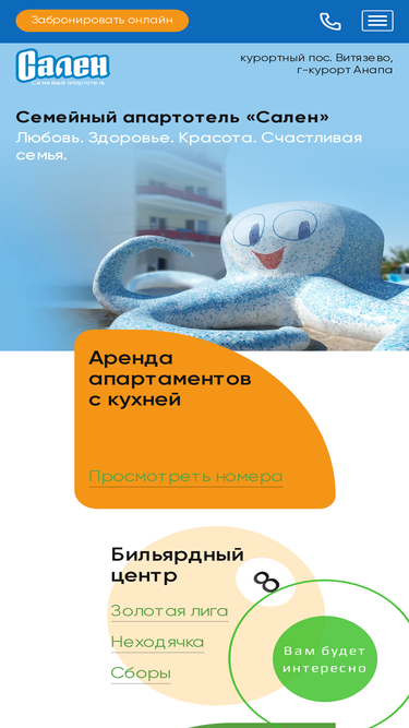 84%семейный апартотель «сален». >семейный апартотель «сален» приглашает отдохнуть семьи с детьми на черноморском побережье в курортном поселке витязево. море в районе анапы самое чистое в черноморском бассейне
