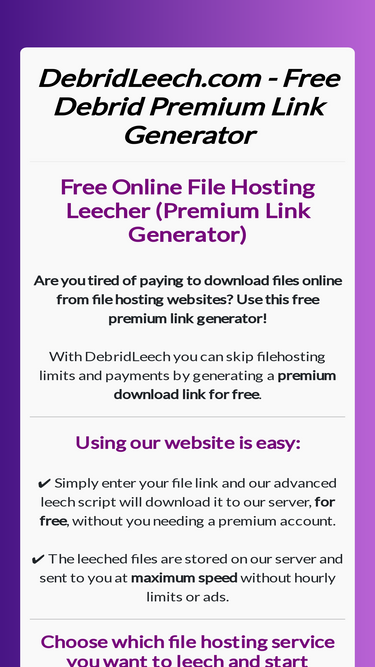 91%With DebridLeech you can skip filehosting limits and payments by generating a premium download link for free.