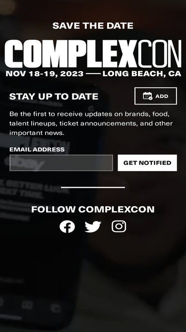75%Join us at ComplexCon 2026, the cultural festival bringing together the world of streetwear, music, art, and food. October 3-4, 2026 Los Angeles