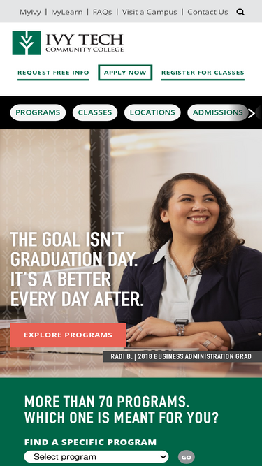 78%ivy tech community college offers associate's degrees and certificates to students in more than 70 programs in over 75 communities across indiana.