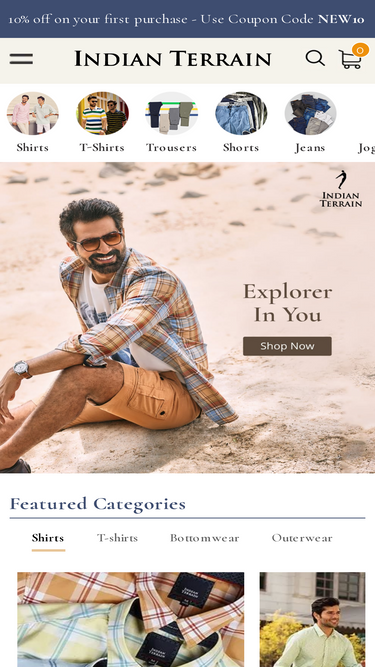 92%Indian Terrain is India's leading brand for Men's clothing. Buy shirts, t- shirts, jeans, trousers, joggers, shorts, jackets, sweaters, coats, sweatshirts & boxers.
