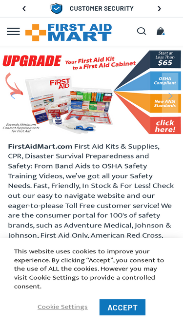 96%firstaidmart.com | your source for first aid, safety and disaster supplies. firstaidmart.com – first aid kits & supplies, cpr, disaster survival preparedness and safety – from band aids to osha safety training videos we’ve got all your safety needs - fast, friendly, in stock & for less! check out our easy to navigate website and our eager-to-please toll free customer service! we are the consumer portal for many safety brands, such as adventure medical, lifeline first aid, first aid only, american red cross, genuine first aid, mayday, guardian survival, prestan products, cpr prompt and so many others. we are the master distributor for these companies and offer these products at the lowest price possible.