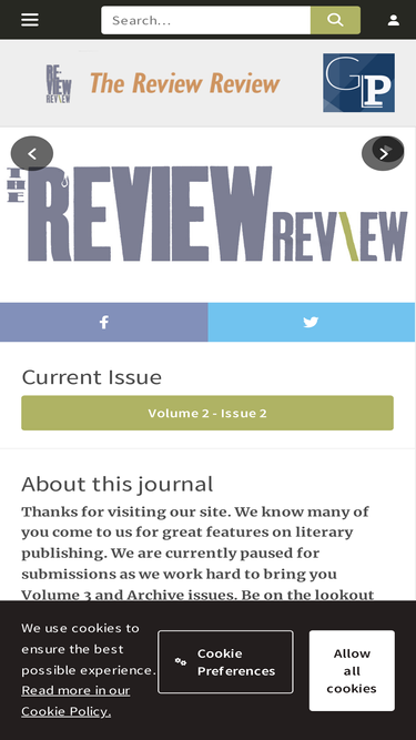 100%thanks for visiting our site. we know many of you come to us for great features on literary publishing. we are currently paused for submissions as we work hard to bring you volume 3 and archive issues. be on the lookout for submissions to resume in the near future alongside this new content. the review review is an open-access journal supporting writers, editors, students, and teachers by offering reviews of recent issues of literary magazines, interviews with editors of literary magazines, and features on the publishing industry. we are grateful to the foley library center at gonzaga university for giving us a new home, and especially to scholarly communication librarian shayna pekala for helping make this a reality. journal editors please note our new address: thereviewreview/jeffrey doddgonzaga university502 e. boone avespokane, wa 99258 the process of migrating content from the original review review platform continues. for access to reviews, interviews, or features published prior to june 2019, you may use the search tool or explore the issues in volume 1. if you don't find what you are looking for, please use this navigation link, courtesy of the internet archive: https://web.archive.org/web/20190719101859/http://www.thereviewreview.net/ still looking for something? please use the contact link at the top of this page.