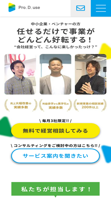 77%株式会社Pro-D-useについて、よく頂くご質問(Q&A)を紹介します。具体的には、提供サービスや経営コンサルタント、依頼内容、費用、サービスの流れ・利用方法や契約についてご紹介します。