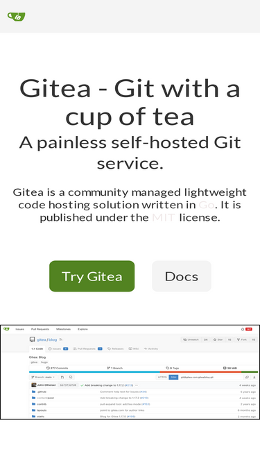 72%Gitea - Git with a cup of tea! Painless self-hosted all-in-one software development service, including Git hosting, code review, team collaboration, package registry and CI/CD