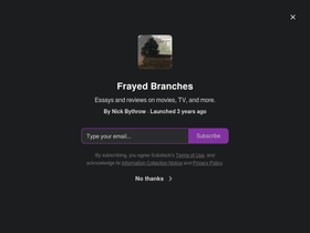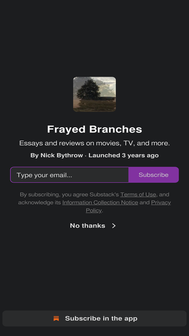 85%Essays on media. New posts Tuesdays and Thursday at 5 PM EST. Click to read Frayed Branches, by Nick Bythrow, a Substack publication with hundreds of subscribers.