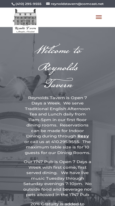 100%Contact us Reynolds Tavern Thanks for visiting! Are you Interested in hosting a PRIVATE EVENT / PRIVATE PARTY at Reynolds Tavern? E-mail our Event Coordinator at Events@ReynoldsTavern.com or call us at 410-934-7663. Have any questions or comments?Please feel free to contact us by reaching out through the form below. We look forward to hearing from you!