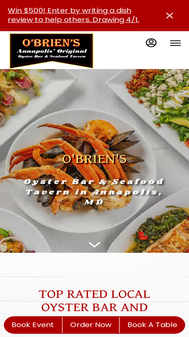 90%o'brien's oyster bar & seafood tavern annapolis classic book my event make a reservation award winning brunch saturday- sunday, until 2pm established in 1774 annapolis maryland has an abundance of historical locations. from the oldest statehouse in the union to the landing place of kunte kinte. annapolis has history covered. so, of course the town’s