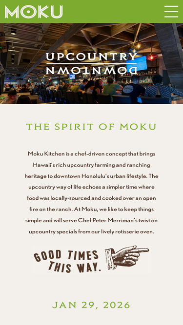 82%Moku Kitchen is a chef-driven concept that brings Hawaii’s rich upcountry farming and ranching heritage to downtown Honolulu’s urban lifestyle. The upcountry way of life echoes a simpler time where food was locally-sourced and cooked over an open fire on the ranch. At Moku, we like to keep things simple and will serve Chef Peter Merriman’s twist on upcountry specials from our lively rotisserie oven.