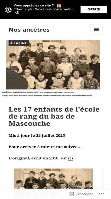 88%Plus que trois enfants de l’école de rang du bas de Mascouche avant la fin de notre voyage dans les années 30. Noël Lauzon 1930-2012 Si j’ai voulu écrire sur les ancêtres et les descendants des enf…