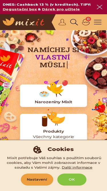 82%Na Mixit.cz si můžete namíchat svoje müsli, kaše nebo mix ovoce, oříšků a čokolády. Vše vám v krásném tubusu pošleme až domů nebo si vyzvednete na jednom z odběrných míst.