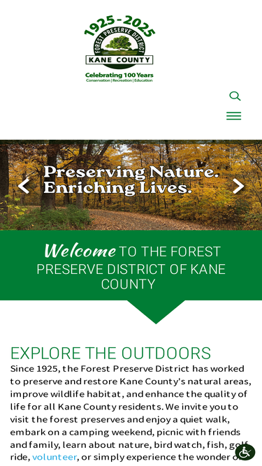 79%since 1925, the forest preserve district has worked to preserve and restore kane county's natural areas, improve wildlife habitat, and enhance the quality of life for all kane county residents. we invite you to visit the forest preserves and enjoy a quiet walk, embark on a camping weekend, picnic with friends and family, learn about nature, birdwatch, fish, golf, ride, volunteer, or simply experience the wonder of our more than 23,000 of acres of woodlands, wetlands and prairies. no matter the time of year, there's plenty to see and do in your kane county forest preserves.