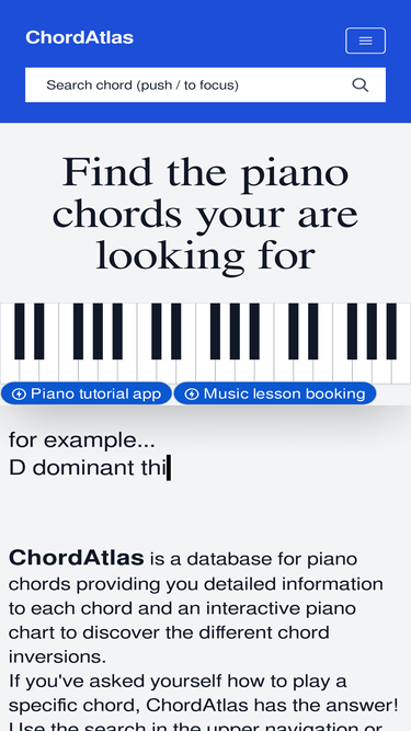 98%ChordAtlas is a database for piano chords providing you detailed information to each chord and an interactive piano chart to discover the different chord inversions. If you've asked yourself how to play a specific chord, ChordAtlas has the answer!