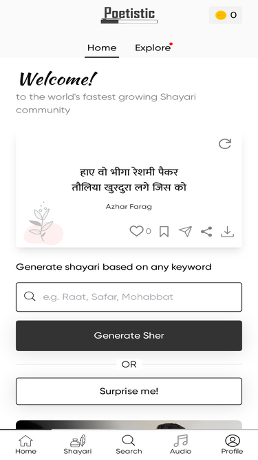 Urdu Shayari and Hindi Kavita of New and Renowned poets. Download shayari images on different templates. Publish your shayari and share with 1 Million+ users.