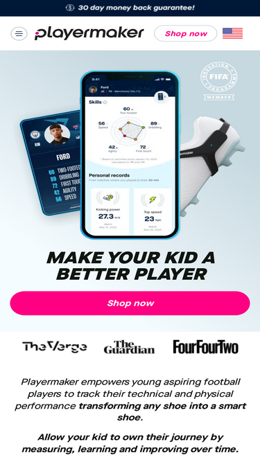 83%Playermaker helps young soccer players and parents track every touch, sprint, and stat with easy-to-use smart sensors and an intuitive app. Trusted by professional clubs worldwide. See real progress, support your child’s growth. Shop Playermaker today and level up!