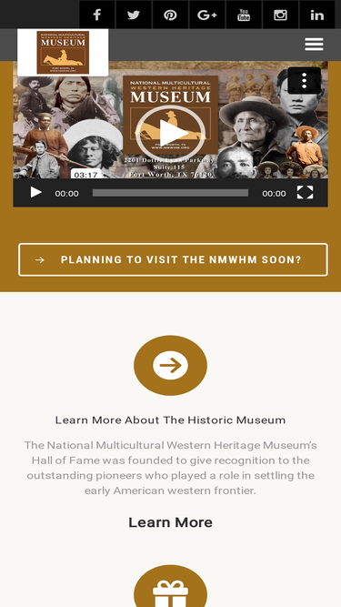 91%Click HERE to View the Museum’s Upcoming Events Sponsors and Corporate Partners Click to View Our Complete List of Sponsors and Corporate Partners Museum Hours of Operation MUSEUM OPERATION HOURS: MONDAY – SATURDAY, 11AM-4PM | (817) 534-8801 BUSINESS OFFICE HOURS: MONDAY – FRIDAY, 9:30AM-5PM | (817) 922-9999 MUSEUM ADMISSION: Adults – 19 – 64 years – $15.00 Sr. Adults: 65 + years – $12.00 Military: $12.00 Youth: 4 – 18 years – $12.00 GROUP RESERVATIONS ARE AVAILABLE MONDAY-SATURDAY GROUP ADMISSION DISCOUNT: $2.00 Off Regular Admission Price for Groups of 10 or More. GROUP RESERVATION CALL: (817) 534-8801 to Schedule Groups of 10 or More or to request a Personal Tour Guide or Presentation for Group. VISIT CONFIRMATIONS OR QUESTIONS: You may call (817) 534-8801 or (817) 922-9999 LOCATION: National Multicultural Western Heritage Museum, 2201 Dottie Lynn Parkway, Suite 115, Fort Worth, Texas 76120. (817) 534-8801 Museum, (817) 922-9999 – Business Office FREE PARKING AVAILABLE | ACCESSIBLE BUILDING WE ARE A BLUE STAR MUSEUM