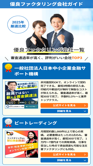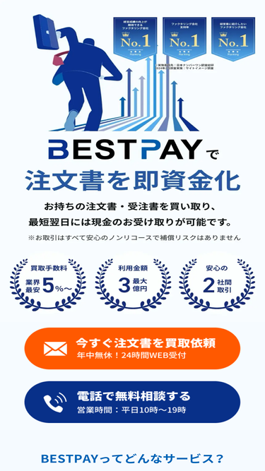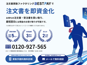 96%ベストファクターは株式会社アレシアが提供する個人事業主でも利用ができ、複数借入・税金滞納・赤字などで他社から断られた場合でも利用ができるオンライン完結ファクタリングサービスです。 最短1時間というスピード入金が可能で、30万円からの少額債権でも対応しています。加えて審査通過率は92%以上と非常に高いの特徴です。 支払いサイトが長い売掛債権の買取も対応しているため、建設業界の方や一人親方の方におすすめのファクタリング会社といえます。 またオンラインファクタリングにも対応しているため、面談が不要で書類も郵送する必要はなく、Web上でアップロードするだけで良いのでスピーディーな資金調達が可能です。 請求書買取ファクタリングのベストファクターの運営会社である株式会社アレシアは、ベストファクターの他にも注文書買取ファクタリングのBESTPAY(ベストペイ)を提供してます。