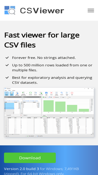 70%Download CSV file viewer. Forever free, no strings attached. Load multiple CSV files with up to 500 million rows at once. Search, filter, and export.