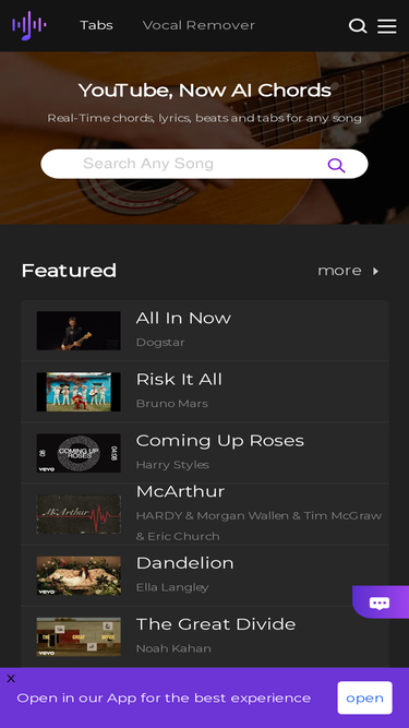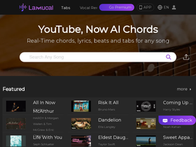 92%ai-generated tabs, chords, lyrics, melodies. edit, transpose, separate tracks, vocal remover easily. also includes interactive learning, which turns any music or song (youtube, mp3) into chords. play along with guitar, ukulele, or piano.