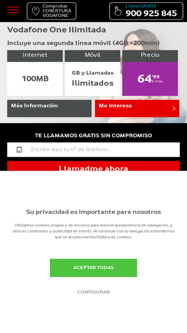 81%vodafone one ilimitada ofrece el servicio de fibra 100mb, móvil y fijo al mejor precio. además, podrás disfrutar de los mejores precios de tv y smartphones.