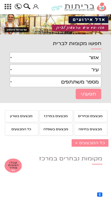 73%פורטל בריתות - מידע לתכנון אירוע ברית מילה או בריתה בקלות. ספקים, אולמות אירועים קטנים, מקומות מומלצים לברית, אולם קטן לאירוע, מסעדות או מסעדה לבריתה ועוד