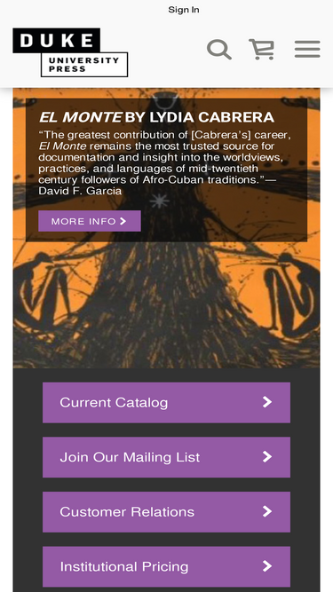 89%Duke University Press is a not-for-profit scholarly publisher specializing in books, journals, open access, and other digital publishing initiatives in the humanities, social sciences, and mathematics. Our mission is to advance the frontiers of knowledge and contribute to the international community of scholarship.