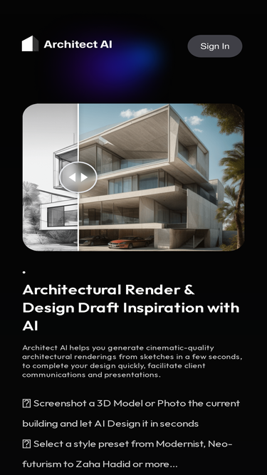 80%Say goodbye to architectural renderings that take hours. Architect AI helps you generate high-quality architectural renderings from conceptual sketches in just a few seconds. This is the GPT of the architectural design world to complete your design quickly, facilitate client communications and presentations. AI Exterior Design.