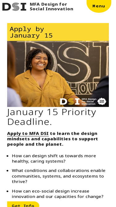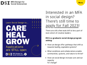 100%The MFA Design for Social Innovation program explores design-based practices that facilitate the conditions and relationships resulting in lasting social change. As a graduate department in the School of Visual Arts (SVA) in New York City, we support enduring connections in art and design to increase creativity and imagination in all aspects of life.