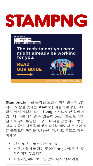 100%stampng는 무료 온라인 도장 이미지 제작 앱입니다. 투명 배경의 고화질 png 도장 이미지를 만들 수 있으며, 회원가입이나 로그인 없이 바로 이용할 수 있습니다. 또한 국내외 주요 증권시장 지수를 확인할 수 있는 기능과 로또6/45 당첨번호조회, 로또 번호 생성 기능을 제공합니다.