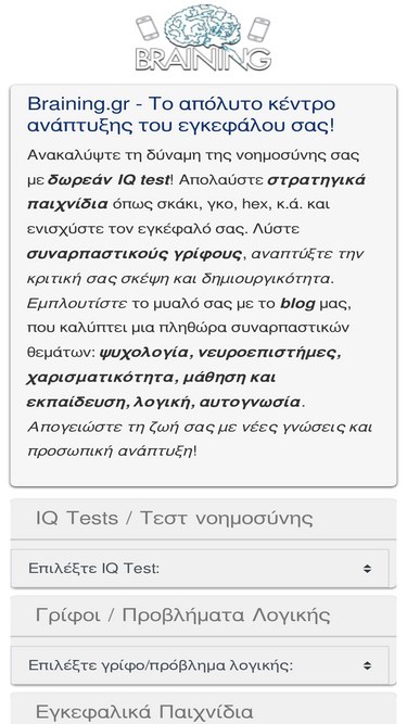 80%Βελτιώστε τη νοημοσύνη σας με δωρεάν IQ tests, ψυχομετρικά τεστ και στρατηγικά παιχνίδια. Εξερευνήστε γρίφους λογικής και ένα blog γεμάτο γνώση για προσωπική ανάπτυξη
