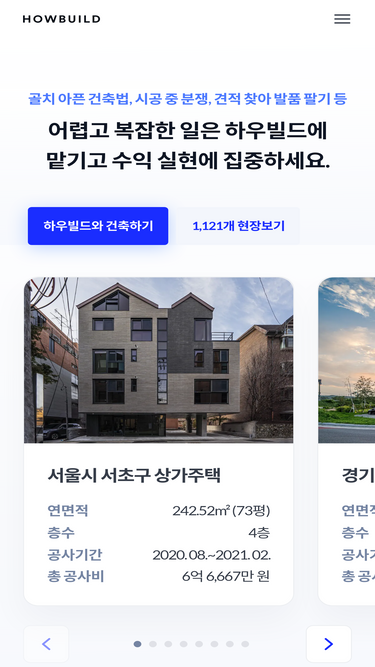 78%건축 사업 계획, 건축사 찾기, 설계 도면 검토, 건설사 찾기, 공사 관리 등 다양한 솔루션을 건축 전문가가 직접 관리합니다. 건축주가 결정하기 어려운 부분을 하우빌드가 지원합니다.