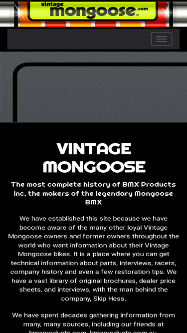87%the most complete history of bmx products. we have established this site for the many other loyal vintage mongoose owners and former owners throughout the world who want information about their vintage mongoose bikes.