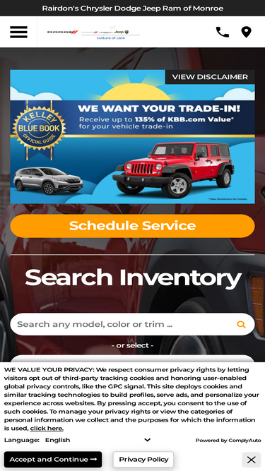 95%between our wide selection of vehicles and our committed and friendly staff, rairdon's chrysler dodge jeep ram of monroe is ready to help you find your next vehicle! come buy your next car from our chrysler dodge jeep ram dealership! we are your source for great deals on new and used cars, trucks and suvs. we serve monroe, mill creek, everett, snohomish, lake stevens and bothell.