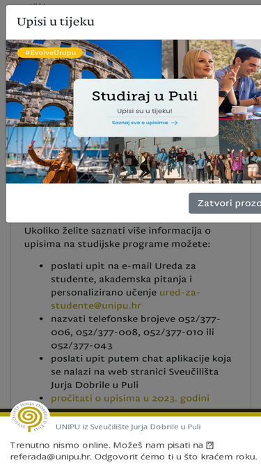 87%Sveučilište Jurja Dobrile u Puli raspisuje Javni poziv studentima za obavljanje administrativnih poslova u odjelu računovodstva. Pozivaju se zainteresirani studenti za obavljanje poslova da najkasnije do 3. lipnja 2022. godine dostave svoju prijavu i životopis na adresu e-pošte: CentarKarijera@unipu.hr sa naznakom "Javni poziv za administrativne poslove u računovodstvu". Predviđena cijena rada: 30,00 kn/h Period rada: 6. lipanj - 31. srpanj