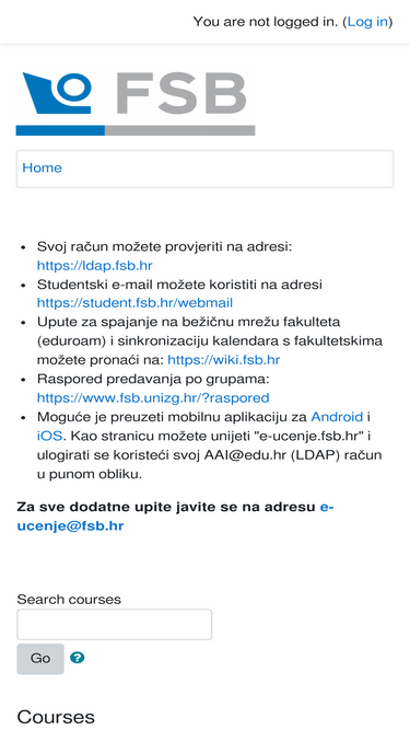 92%- kolegije e-učenja prošle akademske godine možete naći na adresi: https://e-ucenje-arhiva.fsb.hr - svoj račun možete provjeriti na adresi: https://ldap.fsb.hr - studentski e-mail možete koristiti na adresi https://outlook.office.com - više o informacijskim servisima fakulteta možete naći na poveznici. - raspored predavanja po grupama: https://www.fsb.unizg.hr/?raspored - moguće je preuzeti mobilnu aplikaciju za android i ios. kao stranicu možete unijeti "e-ucenje.fsb.hr" i ulogirati se koristeći svoj aai@edu.hr (ldap) račun u punom obliku. za sve dodatne upite javite se na adresu e-ucenje@fsb.hr