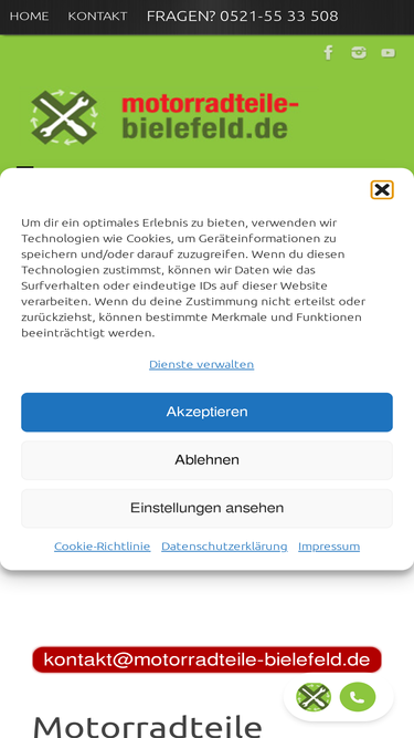79%Ihr erreicht uns montags bis freitags von 10:00 Uhr bis 17:00 Uhr (oft länger…) und samstags von 10:00 Uhr bis 15:00 Uhr (manchmal länger…) unter: +49 5203 925 00 68 +49 176 8487 9494 +49 172 5239 549. Und jederzeit per eMail unter kontakt@motorradteile-bielefeld.de Besuche am Lager sehr gern –
